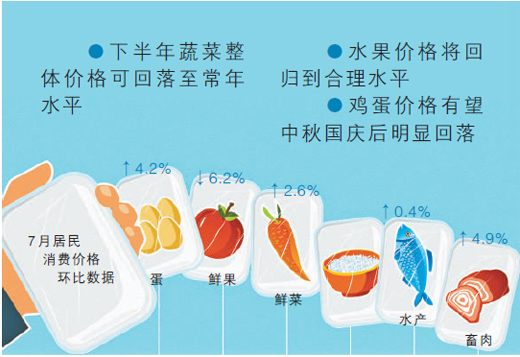 A+ 大日前,國家統計局發布數據顯示,7月CPI(居民消費價格指數)同比上漲2.8%,漲幅比上月擴大0.1個百分點。其中,食品價格同比上漲9.1%,漲幅比上月擴大0.8個百分點,影響CPI同比漲幅擴大約1.74個百分點。