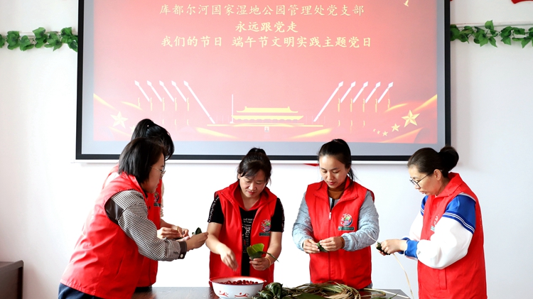 6月2日,庫都爾森工公司庫都爾河國家濕地公園管理處黨支部開展“我們的節日”端午節文明實踐活動,組織黨員志愿者包粽子,為南溝管護站的職工送去慰問品及節日的祝福。(李雯欣 王麗)