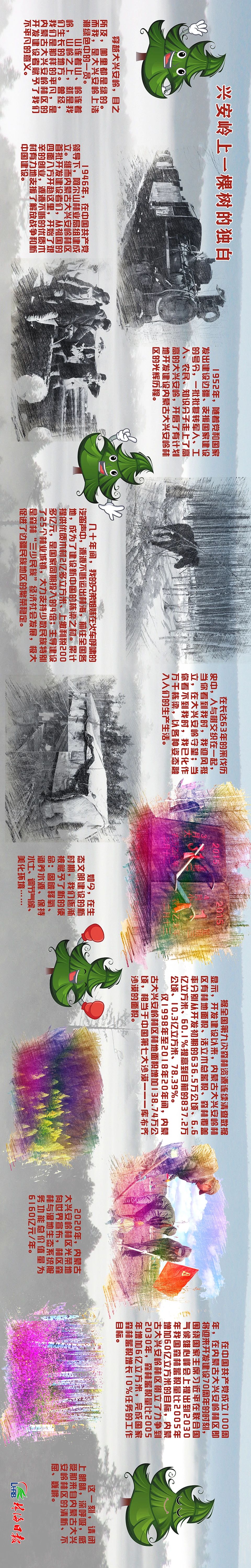 那是1946年,在中國共產黨領導下,阿爾山林業局組建成立。繼而內蒙古大興安嶺林區首批開發建設者們,從祖國的四面八方開赴這里,爬冰臥雪、風餐露宿,開始了艱辛的創業,把青春和生命獻給了這片林海,把子孫留在了這里,一代又一代,揮灑熱血,無怨無悔,源源不斷的優質木材有力地支援了解放戰爭和新中國建設。