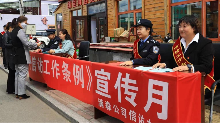 5月18日,滿歸森工公司開展《信訪工作條例》宣傳活動,發放宣傳單300余份,設立咨詢臺解答群眾問題60余件,提高群眾依法信訪觀念和理性維權意識。(趙樹立)