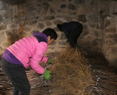 苗窖里陰涼刺骨,但育苗工熱情不減,她們分工有序,運苗、碼垛、覆土、澆水,每個工序都有條不紊地進行著。王靜宇介紹說:“苗木入窖是有技術要求的,一層苗,一層沙,一層水,可以提高苗木存活率。”