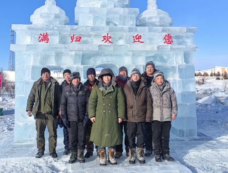 “1、2、3,茄子!”近日,由滿歸森工公司設計創作的冰雕作品“滿歸歡迎您”和雪雕作品“鹿鳴興安”在金河“北極村完成,工作人員開心地在冰雕作品前拍照留影。