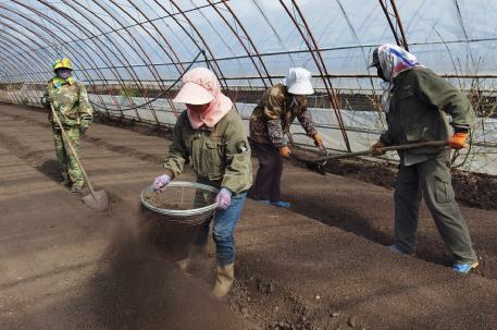 作業(yè)中,育苗工根據(jù)種子質(zhì)量計算播種量,稱重后放進播種滾中,然后在壟好的標準地塊上播種,再人工對播散不均的地方進行補種。播種完成后,將黑土鏟入特制的篩子中進行覆土過篩,濾去雜質(zhì)和土塊,篩后的細土被均勻地覆在剛播的土地上,保證種子在合適的土壤厚度下保持水分和透氣性。