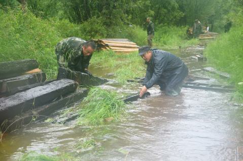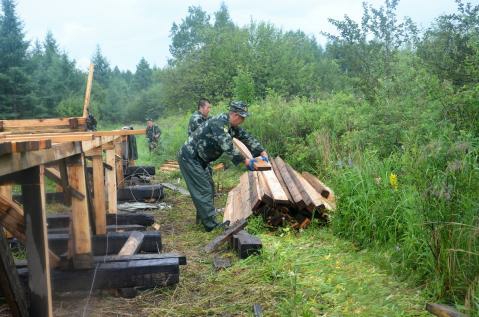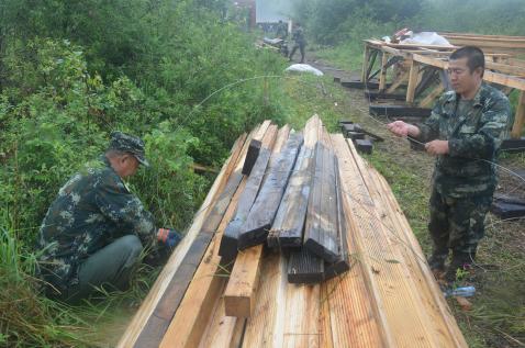 連日來,滿歸地區持續降雨,激流河水位不斷上漲,導致貝爾茨河國家濕地公園內正在施工中的安裝木棧道工作被迫中斷,建筑木料被水浸泡,隨時有被大水沖跑的危險。為及時搶運和規整好建筑木料,避免汛情造成更大的損失,滿歸森工公司應急事務中心迅速組織專業撲火隊員,冒雨搶運木料。