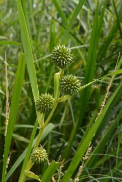 鑒別特征:黑三棱科三棱屬多年生草本植物。根狀莖粗壯,具卵球形塊莖。莖直立,伸出水面,高50—120厘米,上部多分枝。葉條形,先端漸狹,基部三棱形,中脈明顯,在背面中部以下具龍骨狀凸起。圓錐花序開展,具3—5(—7)側枝,每側枝下部具1—3雌性頭狀花序,上部具數個雄性頭狀花序。雌性頭狀花序呈球形;雌花密集,花被片4或5,紅褐色,倒卵形;花柱與子房近等長;柱頭鉆形,單一或分叉。雄花具花被片3—4,膜質,匙形,有細長的爪;雄蕊3,花絲絲狀,花藥黃色。果實倒圓錐形,呈不規則四棱狀,褐色。