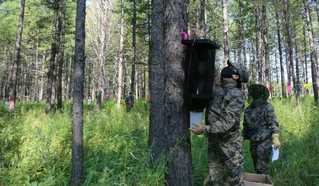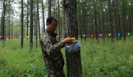 隨后,參賽選手又進行了綁樹環、誘捕器的組裝懸掛和背負式噴霧機噴霧3個比賽項目的激烈角逐。“綁樹環的碗口朝上朝下要根據季節而定,現在是秋天,碗口朝上是監測落葉松毛蟲下樹期的情況,監測下樹越冬蟲口密度和下樹時間。”森防站測報員李雅琴說。