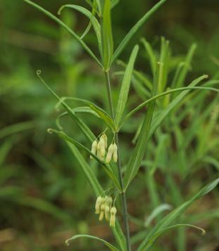 鑒別特征:百合科多年生草本;根狀莖肥厚,橫生,圓柱形有少數須根,黃白色;莖高30—90厘米;葉無柄,4—6輪生,平滑無毛,條狀披針形,先端拳卷或彎曲呈鉤形;花腋生,常有2—4朵花,呈傘形狀,花梗下垂;花梗基部有苞片,膜質,白色,條狀披針形;花被白色至淡黃色稍帶綠色;漿果,成熟時藍黑色。