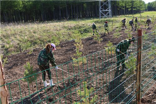 育林林場女職工正在綠化帶扶正樟子松苗和清理客土中石塊。