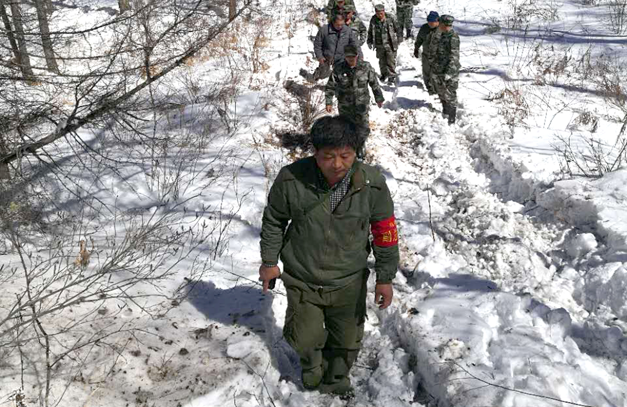 大興安嶺的四月積雪消融,草木枯干??晌挥谂d安里生態功能區內的古利奇納山卻是冰雪世界,積雪平均厚度40CM左右,局部地段深達近1米,山腳距206基站距離約3公里。為了確保通訊暢通,森林消防隊25名有經驗的運材司機和撲火隊員踏雪爬上了古利奇納山防火通訊基站,他們向山上運送了食物和通訊用電瓶。