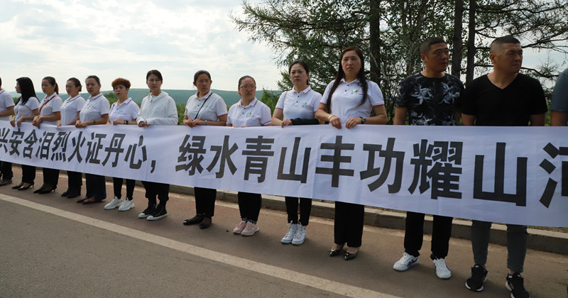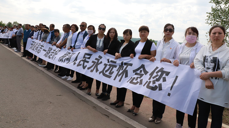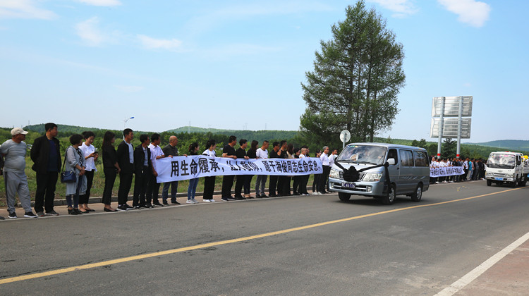 “向撲救雷擊火災犧牲的于??⊥旧钋邪У?rdquo;、“魂系根河,血灑興安,您把一生獻給了大森林,于海俊同志安心走好”、“于??⊥?,您是林業建設的尖兵,為林業生態建設作出了巨大貢獻”、“用生命履承,讓人敬佩 ,愿于海俊同志生命安息”……6月23日上午, 根河林業局400余名干部職工、社會各界人士及當地群眾站在道路兩旁手拿條幅,紛紛自發前來為于??⊥舅托小?