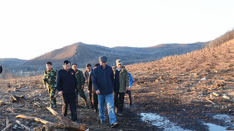 閆宏光、宋德才一行在畢拉河林業(yè)局達(dá)爾濱湖林場實地踏查災(zāi)后植被恢復(fù)工作。