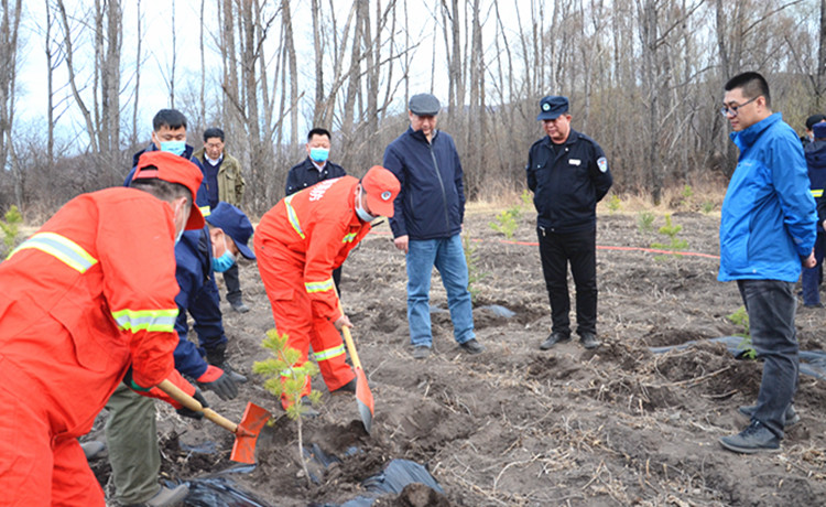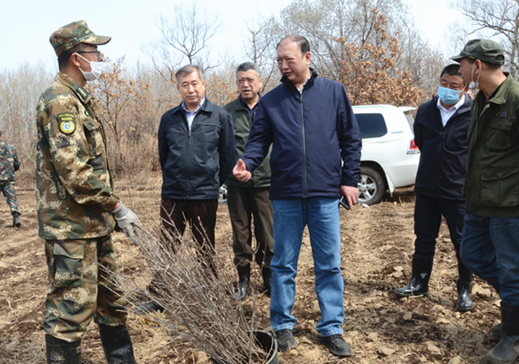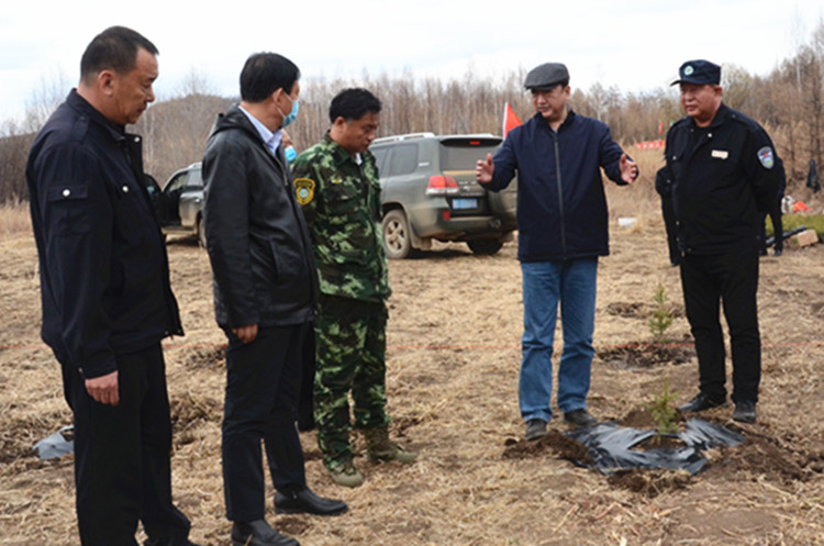 在大楊樹林業局庫莫林場,閆宏光、宋德才一行走進造林現場,實地查看造林樹種,了解造林進度,強調搶抓造林有利時機,統籌抓好防火、造林工作,火要防好,樹要栽好。