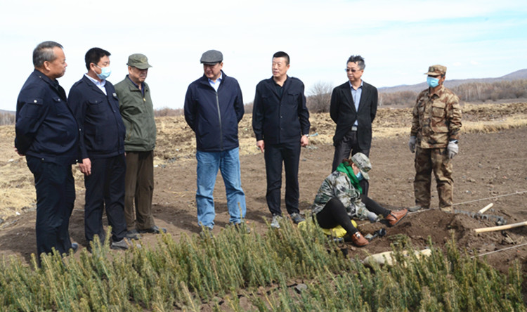 在克一河林業局索圖罕林場退耕還林地塊,閆宏光、宋德才一行查看苗木質量,了解造林情況。