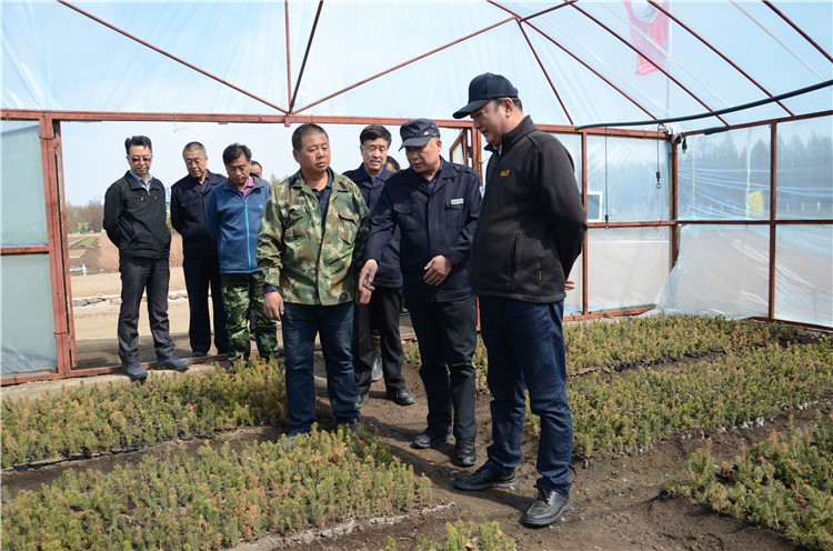 在滿歸林業局苗圃,閆宏光、高昇一行逐一查看育苗大棚,了解育苗種類、數量,強調要搶抓頂漿造林期,及時開展植樹造林,提高造林成活率。