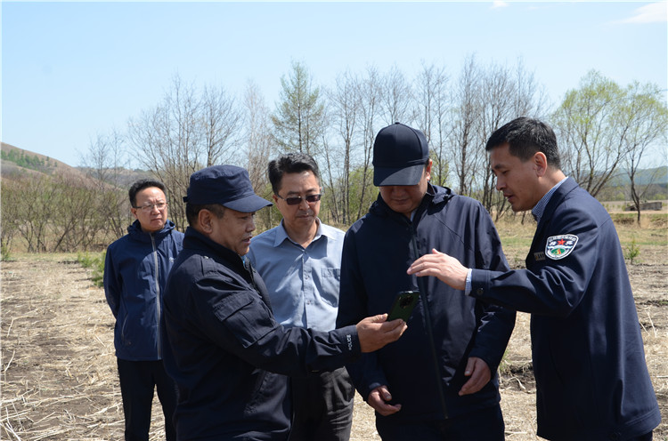 在莫爾道嘎林業(yè)局長青林場(chǎng)退耕還林地塊,閆宏光、高昇一行實(shí)地檢查造林進(jìn)度、質(zhì)量,了解造林設(shè)備。