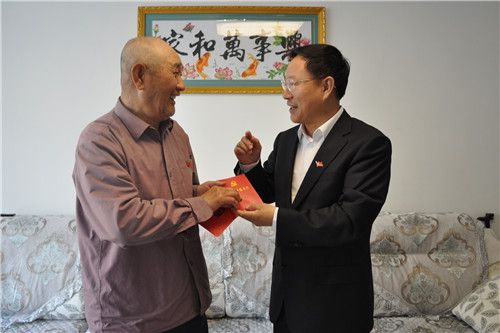 6月28日,在“七一”建黨節即將到來之際,內蒙古大興安嶺阿爾山林業局主要領導走訪慰問了林業局離休老黨員和患病老黨員,為他們送去了慰問金和《黨章》、《習近平總書記系列重要講話讀本》和《習近平總書記談治國理政》圖書,并現場為他們戴上黨徽,激發了他們的歸屬感和榮譽感。(包薩其拉桂)