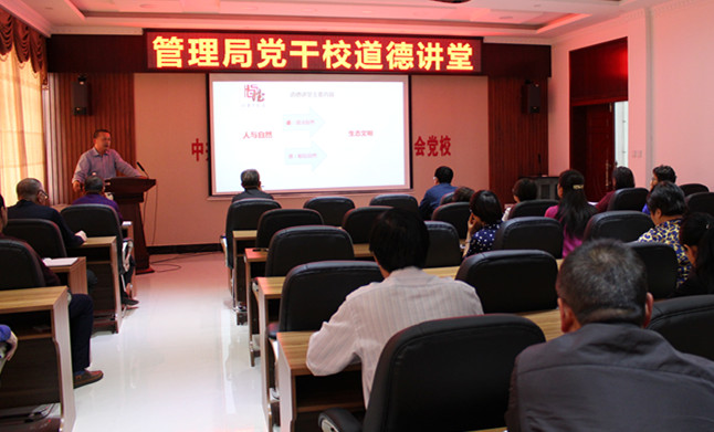 道德講堂活動按照“唱歌曲、學模范、誦經典、送祝福、講專題、作點評”六個環節開展。在“唱歌曲”環節中,教職工學唱了《公民道德歌》;在“學模范”環節中,通過觀看專題片的形式,學習了榮獲感動內蒙古人物提名獎的綽源林業局防火瞭望員顏士文20余年守護林海的先進事跡;在“誦經典”環節,學習了習近平總書記關于生態文明的建設的新思想、新觀點和新論斷;在“送祝福”環節,道德宣講員為大家送上了人與自然和諧相處的祝福,祝福人人追求環境之美、和諧之美;在“講專題”環節,學校教師結合管理局黨委開展的“生態保護建設”大學習大討論活動,作了《恪守生態建設使命 夯實綠色發展根基》專題解讀;在“作點評”環節,校領導對本次道德講堂活動的意義和效果作出了評價,倡導理論與實踐相結合,把生態文明建設納入到黨校課程當中,扎實開展生態保護與建設的教學培訓與科研工作,為推進林區生態文明建設作出應有的貢獻。