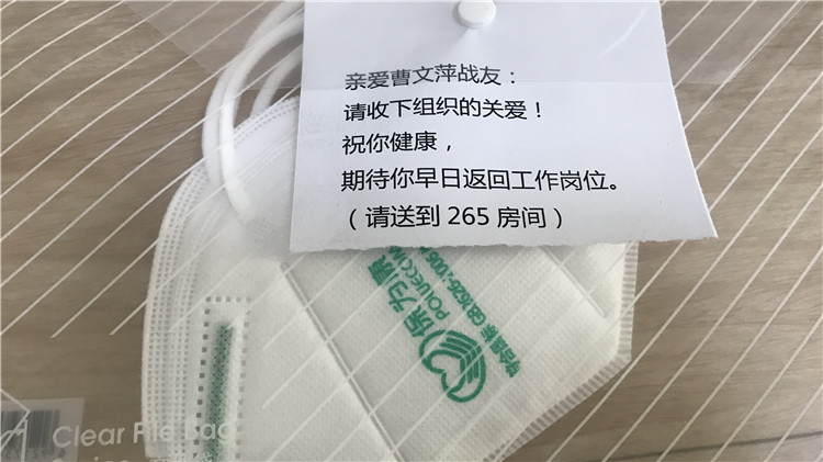 起初,我的內心也是恐慌的,因為這是我人生中第一次經歷隔離,第一次離家人如此之近,卻又覺得甚是遙遠,心中的苦楚難以隱忍。可就在昨天,我收到了來自我的單位得耳布爾森林公安局溫暖的慰問。口罩、水、信件,以及對我們這些被隔離人員衣食住行的關心都深深的打動了我。溫暖的口罩、甘冽的泉水,短短的信件,不僅僅是對我健康的慰問,更是對我回歸的期盼。