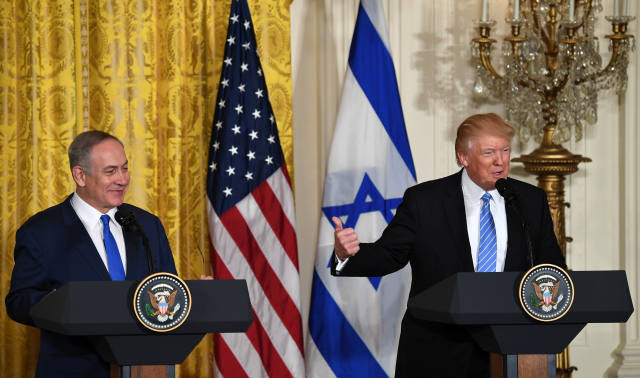 2017年2月15日,在美國華盛頓白宮,美國總統特朗普(右)與來訪的以色列總理內塔尼亞胡舉行聯合記者會。(新華社記者 殷博古攝)