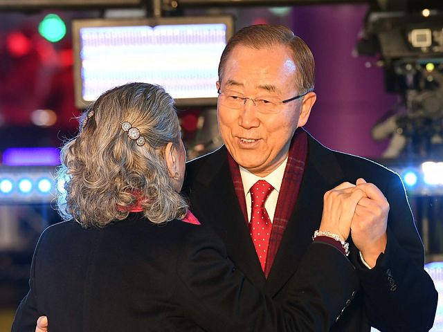 A+ 大2016年12月31日,美國紐約時報廣場,卸任的聯合國秘書長潘基文與妻子在迎新年慶祝活動上翩翩起舞。(新華/法新)