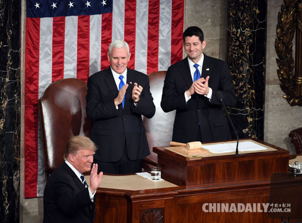 A+ 大2月28日,美國總統特朗普(左)在華盛頓國會山準備發表演講,副總統彭斯(中)和眾議院議長保羅·瑞安出席。(圖片來源:新華社)