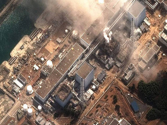 2011年3月14日拍攝的衛(wèi)星照片顯示:日本福島第一核電站3號反應(yīng)堆爆炸后冒著濃煙。(新華/法新)