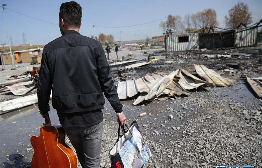 4月11日,在法國敦刻爾克市郊的格朗德桑特難民營,一名難民走過火災后的廢墟。據法國媒體報道,位于法國北部諾爾省的一所大型難民營當地時間11日凌晨疑因人為縱火致10余人受傷。 新華社/美聯