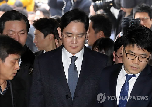 2月16日,三星電子副會長李在镕(中)前往法院受審。(韓聯(lián)社)