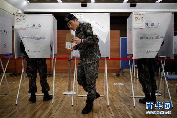5月4日,在韓國首爾,一名士兵在一處投票站參加總統選舉“事前投票”。新華社/路透