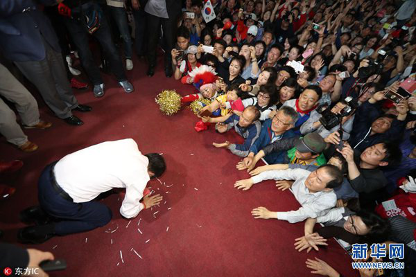 自由韓國黨總統候選人洪準杓5月3日在大邱東城路舉行競選游說活動時,竟直接跪地向市民行大禮求支持。