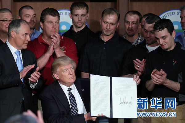 在20多名煤礦工人和一些政府官員的見證下,特朗普當天在美國環境保護局簽署了這份行政命令,聲稱要“終結(奧巴馬政府發起的)煤炭戰爭”。