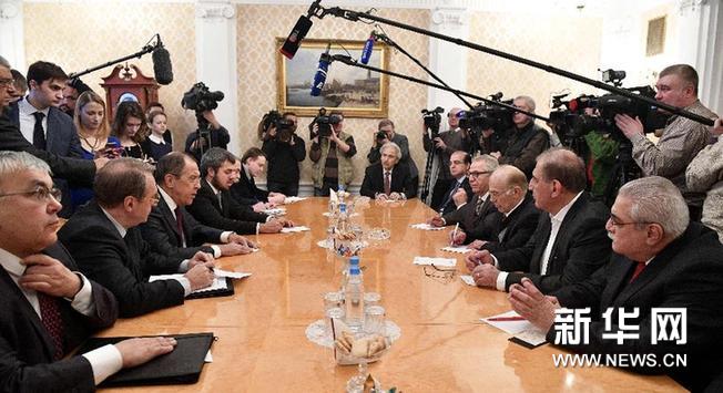 A+ 大1月27日,在俄羅斯莫斯科,俄外長拉夫羅夫(左三)會見敘利亞反對派武裝代表。新華社/法新