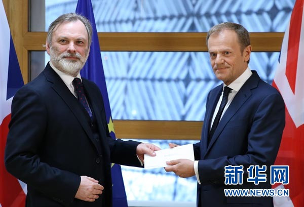A+ 大3月29日,在比利時布魯塞爾,英國駐歐盟大使蒂姆·巴羅(左)將“脫歐”函遞交歐洲理事會主席圖斯克。英國首相特雷莎·梅29日正式向歐盟遞交“脫歐”信函,這意味著在加入歐盟44年后,英國成為首個尋求退出該聯盟的成員國。 新華社發