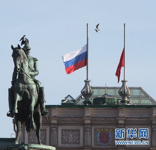 A+ 大4月4日,俄羅斯圣彼得堡立法委員會辦公樓降半旗,悼念地鐵爆炸遇難者。新華社記者魯金博攝