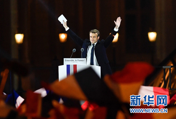 5月7日,在法國(guó)巴黎盧浮宮,馬克龍向支持者致意。法國(guó)多家民調(diào)機(jī)構(gòu)7日晚公布的預(yù)測(cè)結(jié)果顯示,“前進(jìn)”運(yùn)動(dòng)候選人埃馬紐埃爾·馬克龍?jiān)?017年法國(guó)總統(tǒng)選舉第二輪投票中獲得超過(guò)65%的選票,領(lǐng)先極右翼政黨“國(guó)民陣線”候選人瑪麗娜·勒龐,當(dāng)選法蘭西第五共和國(guó)第8位總統(tǒng)。新華社記者陳益宸攝