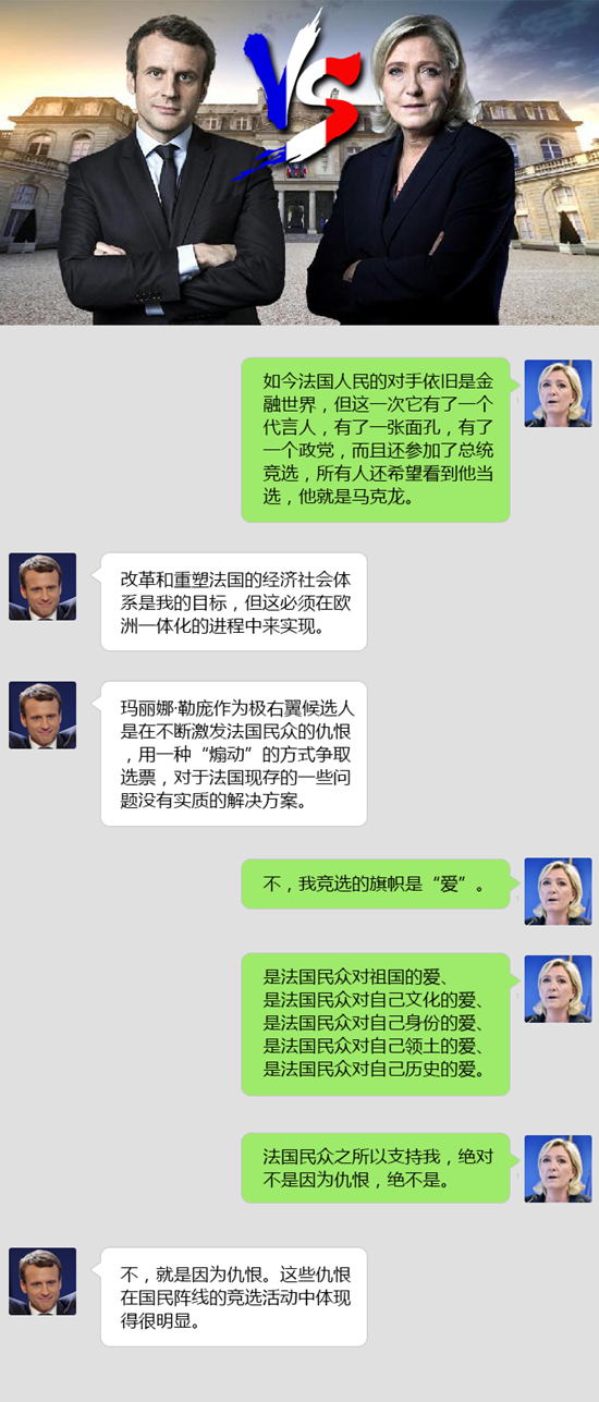 法國《世界報》將馬克龍和勒龐之爭稱為“兩個法國之爭”:一個代表開放、前進、革新的法國;一個代表保守、鎖國、民族主義的法國,“他們幾乎每條政綱都是相互對立的”。