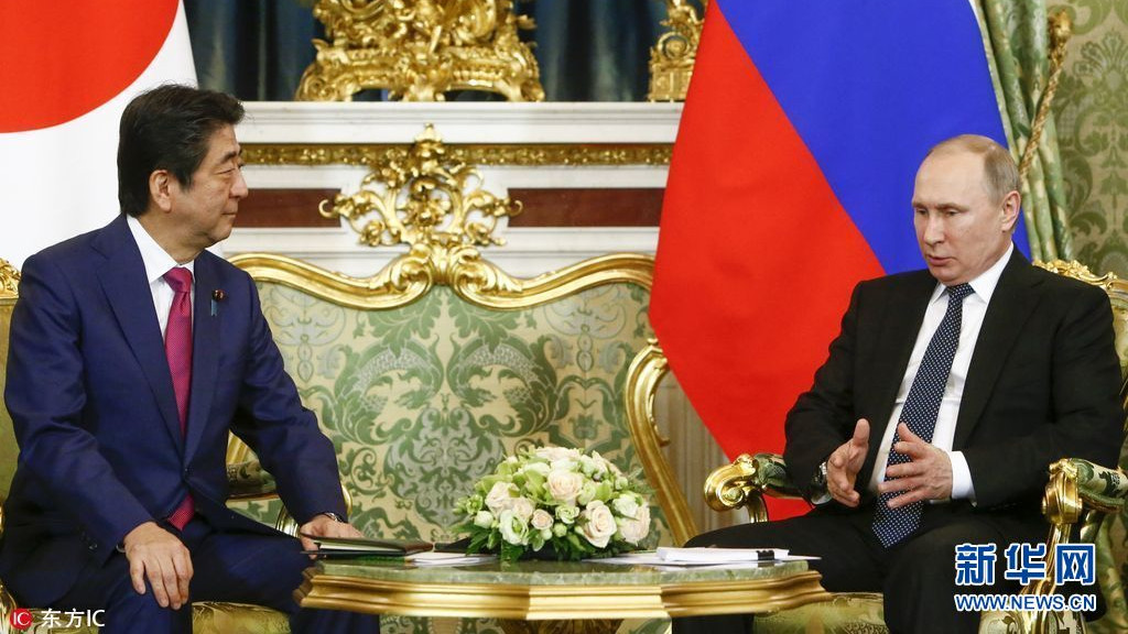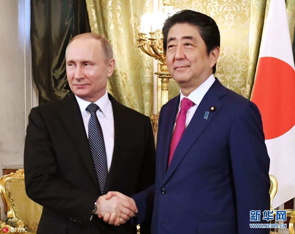 當地時間2017年4月27日,俄羅斯莫斯科,日本首相安倍晉三27日起對俄羅斯展開為期兩天的訪問。安倍與普京在克里姆林宮舉行會面,雙方將就簽署兩國和平條約,包括解決北方四島領土問題交換意見。(圖片來源: 東方IC)