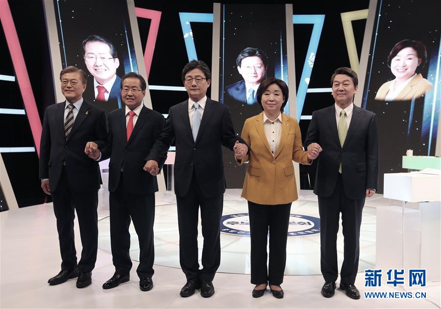 5月2日,在韓國首爾,韓國共同民主黨候選人文在寅、自由韓國黨候選人洪準杓、正黨候選人劉承旼、正義黨候選人沈相奵、國民之黨候選人安哲秀(左至右)在電視辯論前合影。當日,韓國共同民主黨候選人文在寅、國民之黨候選人安哲秀、自由韓國黨候選人洪準杓、正黨候選人劉承旼和正義黨候選人沈相奵在韓國首爾參加最后一次總統候選人電視辯論。韓國將于5月9日舉行總統選舉。新華社/法新