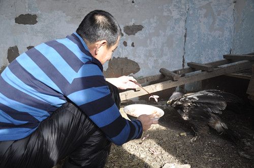 在療傷養(yǎng)護過程中,為了使烏雕盡快康復,早日回歸自然,圖里河林業(yè)局有關(guān)部門負責人和當?shù)氐膼坌娜耸棵刻觳少徤虾玫呐Q蛉馕桂B(yǎng),邀請當?shù)氐尼t(yī)生和獸醫(yī),堅持為其換藥。自從烏雕到家中來,孫會軍夫妻倆待它如自己的孩子般悉心照料。