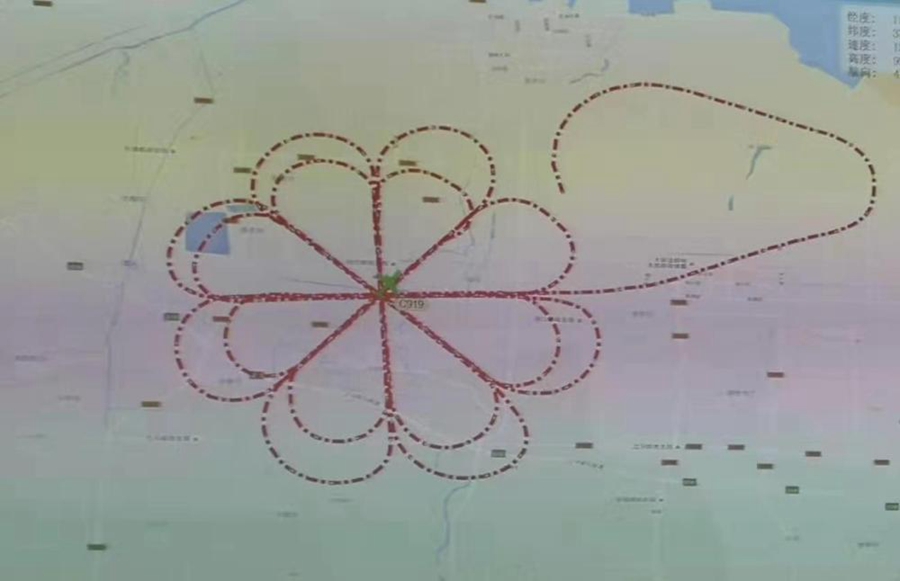 試飛數(shù)據(jù)顯示,7日下午14點(diǎn)06分,飛機(jī)離開東營勝利機(jī)場(chǎng),從不同方向飛過一個(gè)點(diǎn),空中飛行了近4個(gè)小時(shí)。下午18點(diǎn)左右,飛機(jī)降落回東營勝利機(jī)場(chǎng)。