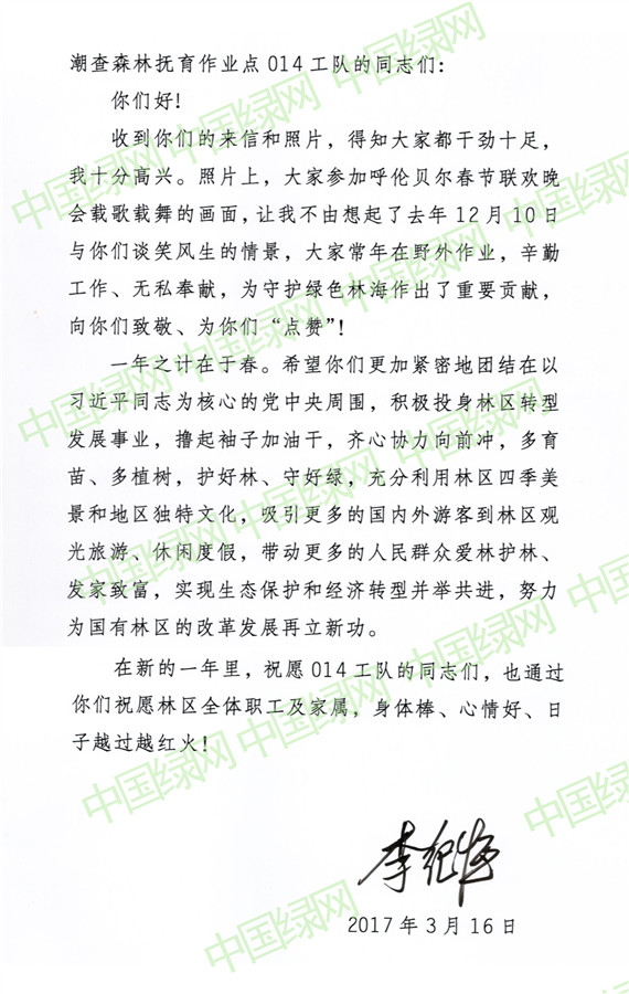 親切的關懷,給林區一線工人以巨大的鼓舞,也給他們留下了非常深刻的印象。他們在努力守護好大森林的同時,一直惦記著李紀恒書記。2017年春節前夕,014工隊的17名一線職工聯名給李紀恒書記寫了一封信,向敬愛的李書記拜年,并附上三張參加呼倫貝爾春節聯歡會的照片。信中匯報了他們一個多月來的工作情況,表示一定會好好干好工作,把林子看好管好。