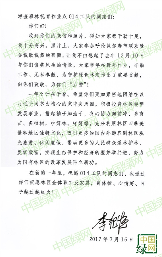 親切的關(guān)懷,給林區(qū)一線工人帶來巨大的鼓舞,也給他們留下了非常深刻的印象。他們在努力守護(hù)好大森林的同時(shí),一直惦記著李紀(jì)恒書記。2017年春節(jié)前夕,014工隊(duì)的17名一線職工聯(lián)名給李紀(jì)恒書記寫了一封信,向李書記拜年,并附上三張參加呼倫貝爾春節(jié)聯(lián)歡會的照片。信中匯報(bào)了他們一個(gè)多月來的工作情況,表示一定會好好干工作,把林子看好管好。