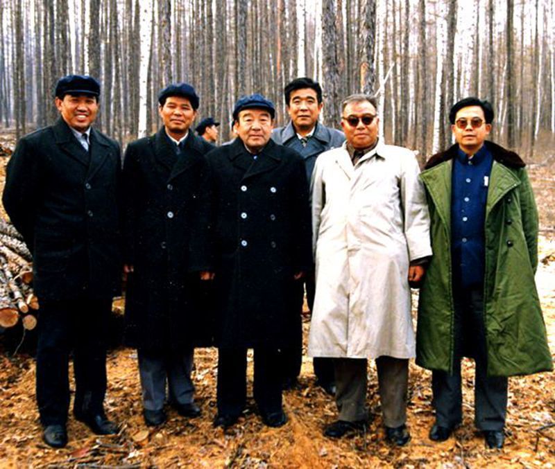 1986年,在克一河局幼壯林中與林、地領(lǐng)導(dǎo)干部在一起。