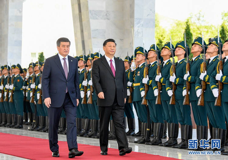 習近平乘車抵達廣場時,受到熱恩別科夫熱情迎接。兩國元首登上檢閱臺。軍樂團奏中吉兩國國歌。兩國元首檢閱儀仗隊。習近平行至儀仗隊中央,用吉爾吉斯語向儀仗隊員問候:戰士們好!儀仗隊員用吉爾吉斯語回答:歡迎您!習近平同熱恩別科夫共同觀看了分列式。