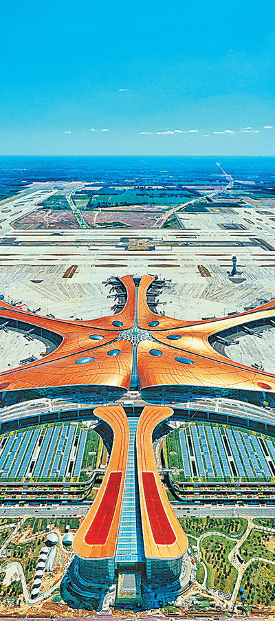 金秋的北京,秋高氣爽,艷陽高照,陽光灑在古銅色的航站樓頂,閃耀出熠熠光彩,北京大興國際機場猶如一只金鳳凰展翅欲飛。