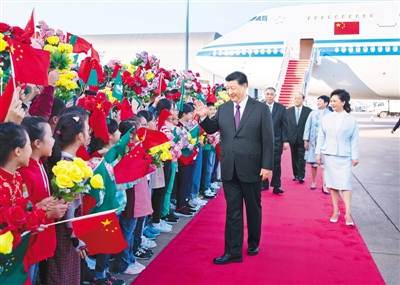 16時許,習近平乘坐的專機徐徐降落在澳門國際機場。習近平和夫人彭麗媛走出艙門,向歡迎人群揮手致意。澳門警察樂隊奏響熱情喜慶的歡迎曲,現場一片歡騰。舷梯旁,兩名澳門少年兒童向習近平和彭麗媛獻上鮮花。在澳門特別行政區行政長官崔世安和夫人霍慧芬陪同下,習近平和彭麗媛同前來迎接的人員親切握手。數百名澳門青少年和各界群眾代表揮動國旗、特別行政區區旗和鮮花,熱烈歡迎習近平的到來。