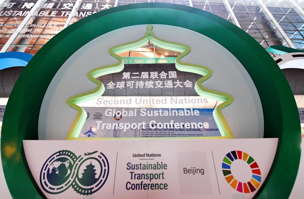 在北京國家會議中心拍攝的第二屆聯合國全球可持續交通大會標志(10月14日攝)。新華社記者 李賀 攝