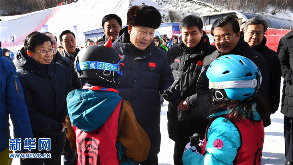 1月23日,中共中央總書記、國家主席、中央軍委主席習(xí)近平在河北省張家口市考察北京冬奧會(huì)籌辦工作。這是習(xí)近平在云頂滑雪場(chǎng)親切勉勵(lì)參加滑雪冬令營的少年兒童。新華社記者 李濤 攝