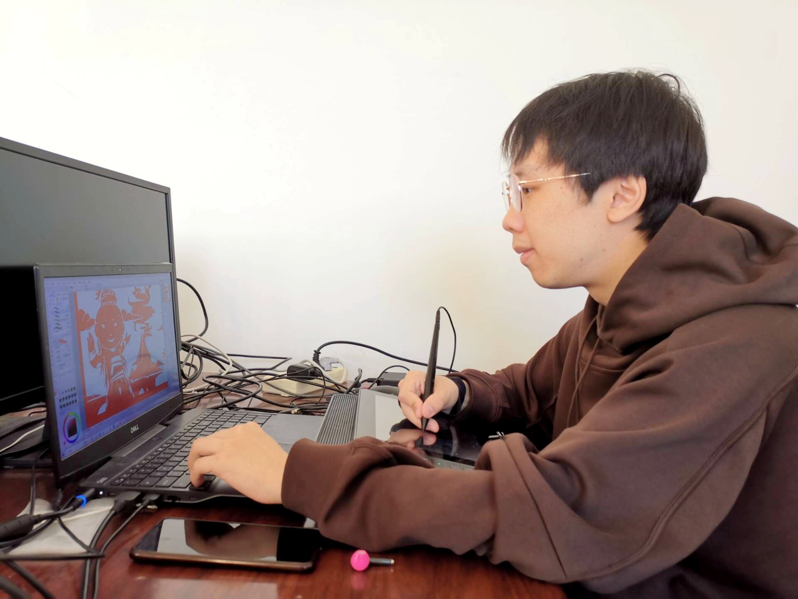 12月4日,綽爾森工公司黨委宣傳部宮詩隆正用電腦及繪畫板創(chuàng)作迎接“十四冬”剪紙圖樣。作品將冰雪運動與剪紙藝術(shù)相融合,表達(dá)出對“十四冬”的祝福和熱切期盼。(孫書程)