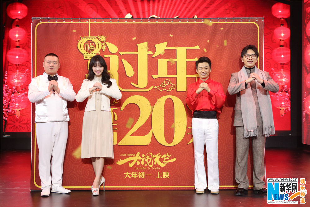過年除了吃年味,還要拍全家福。四位主演便親身示范,解鎖了2017年拍照的新姿勢。他們以掛歷為背景,以電影倒計時、日歷、年畫和古風為主題,一會兒抱著錦鯉莞爾一笑,一會兒拿著紅燈籠賣萌比心,留下了歡樂喜慶的“天竺全家福”。在最后的“民國風”全家福拍攝中,岳云鵬主動請纓:“我還是個寶寶。”說罷他便直接坐在了王寶強的大腿上。于是畫面中柳巖和白客則分別站在兩側,王寶強像是長輩抱著家里的“寶寶”岳云鵬,現場爆笑連連。發布會上四人還化身“送財童子”,在現場撒禮物雨、贈送年貨,這場歡樂的“春晚”式發布會在經典跨年曲目《難忘今宵》中落下帷幕。
